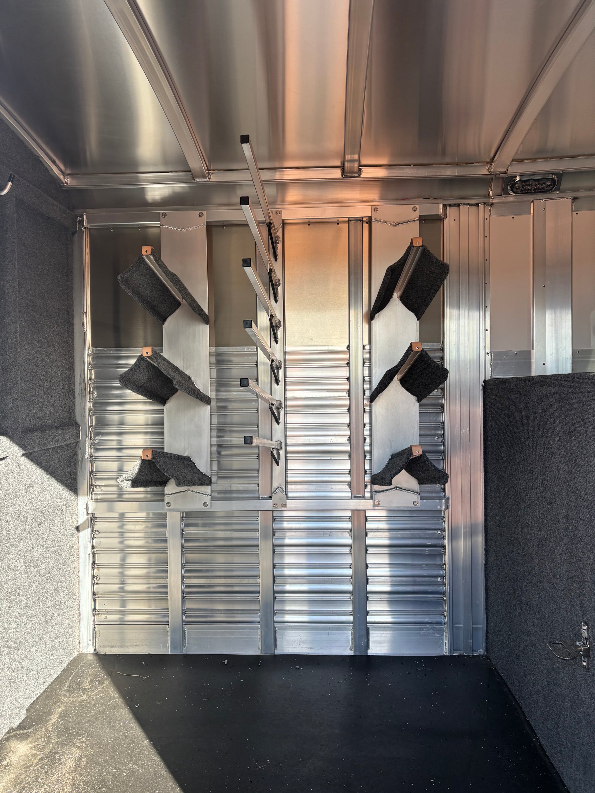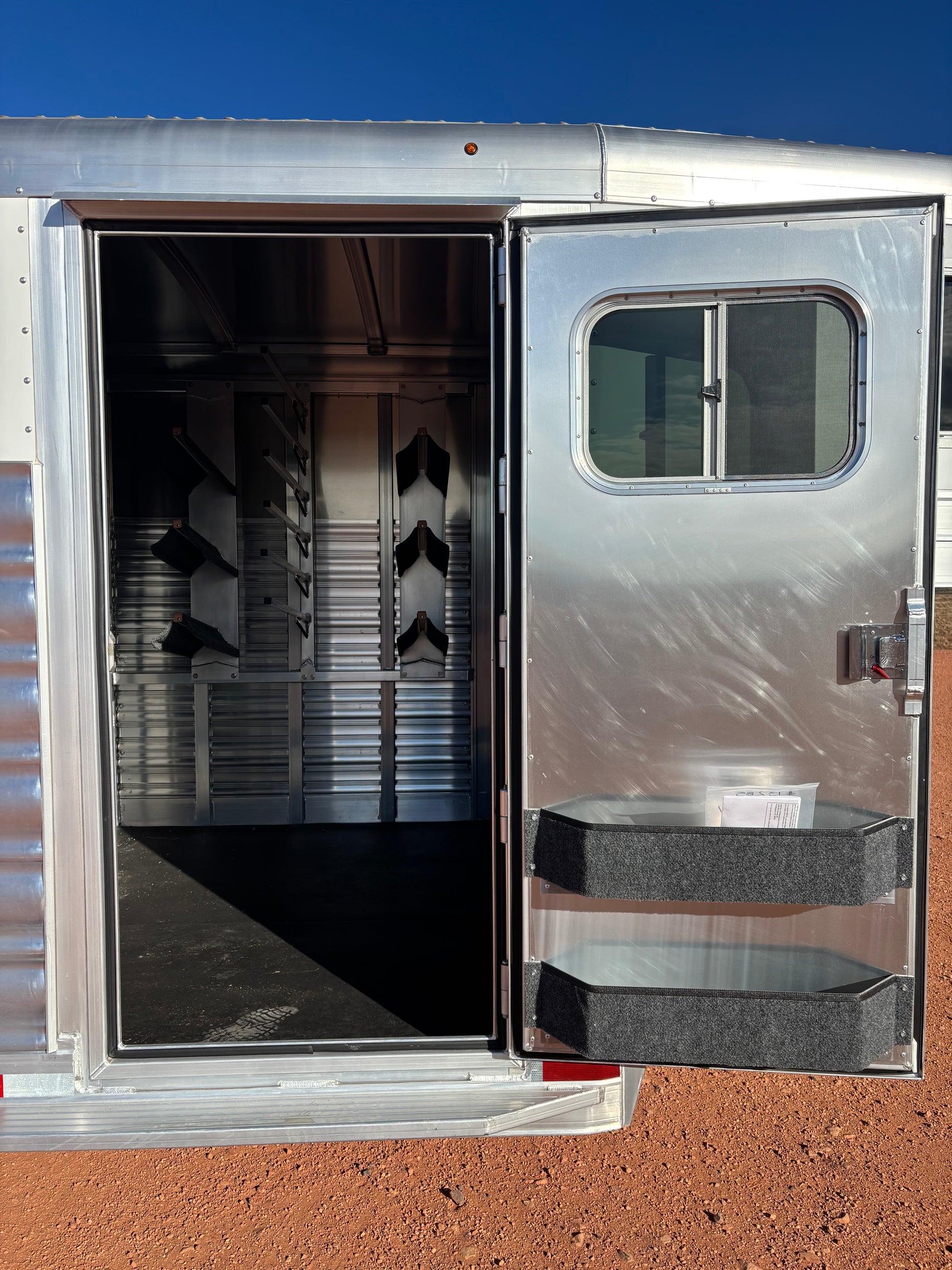 - 6' Tack Room: 6 Saddle Racks, 6 Blanket Bars, Bridle Hooks, x2 Brush Trays on Door, Carpet on Bulkhead Wall