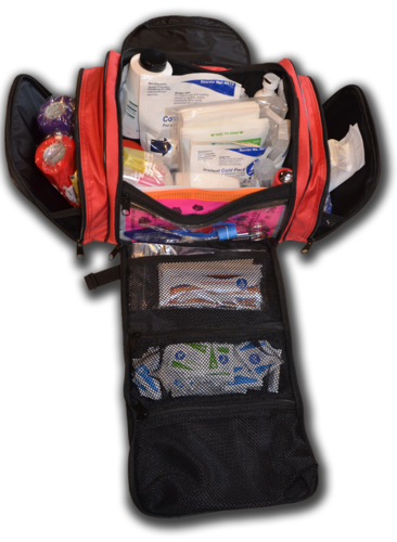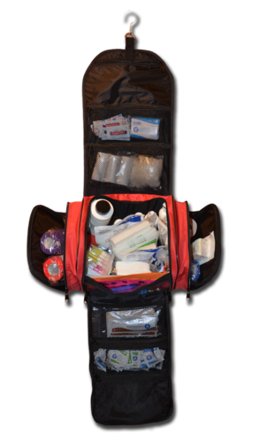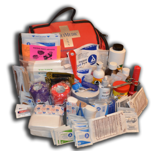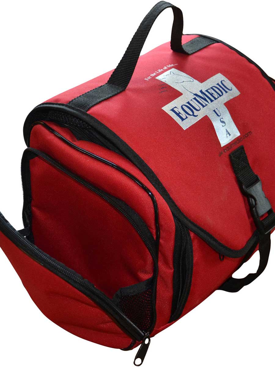 Kit Contents: EquiMedic USA Soft-Sided Large Hanging Medical Bag; Alcohol Wipes; Sanitizing Wipes; Povidone Iodine Swabsticks; Bloodstop Powder; Eye Wash; Flashlight; Non-Sterile Dressings; Small & Medium Sterile Dressings; Non-Adherent Dressings; Exam Gloves; Hoof Pick; Long Wooden Handled Cotton Applicators; Tourniquet; Medical Towels; 2” & 4”Cohesive Tape Rolls; Wood Applicators; ¾” Self-Adhesive Bandages; 1” Self-Adhesive Bandages; Bandage Scissors; Bandage Pins; Betadine Surgical Scrub; Antiseptic Ointment; Cotton Roll; Electrolyte Powder; Hydrogen Peroxide; Liniment; Thumb Forceps; 2” Elastic Adhesive Tape Roll; Iodine Wipes; Rolled White & Brown Gauze; Microbial Wipes; Germicidal Wipes; Small & Large Instant Cold Packs; Betadine Solution; Wrap Cutter; Emergency Blanket; 3cc, 6cc, 10cc, 20cc & 30cc Syringes; 18g X 1”, 20g X 1”, 18g X 1.5” & 20g X 1.5” Hypodermic Needles.