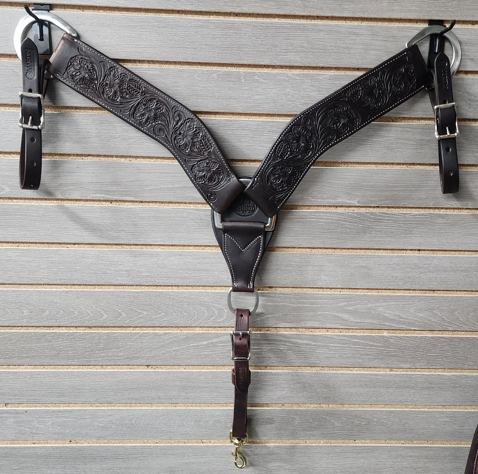 2.75" Chocolate Prairie Flower Tooled Leather Breast Collar that is a contoured fit. This Martin Saddlery breast collar is the perfect size for team roping and more!