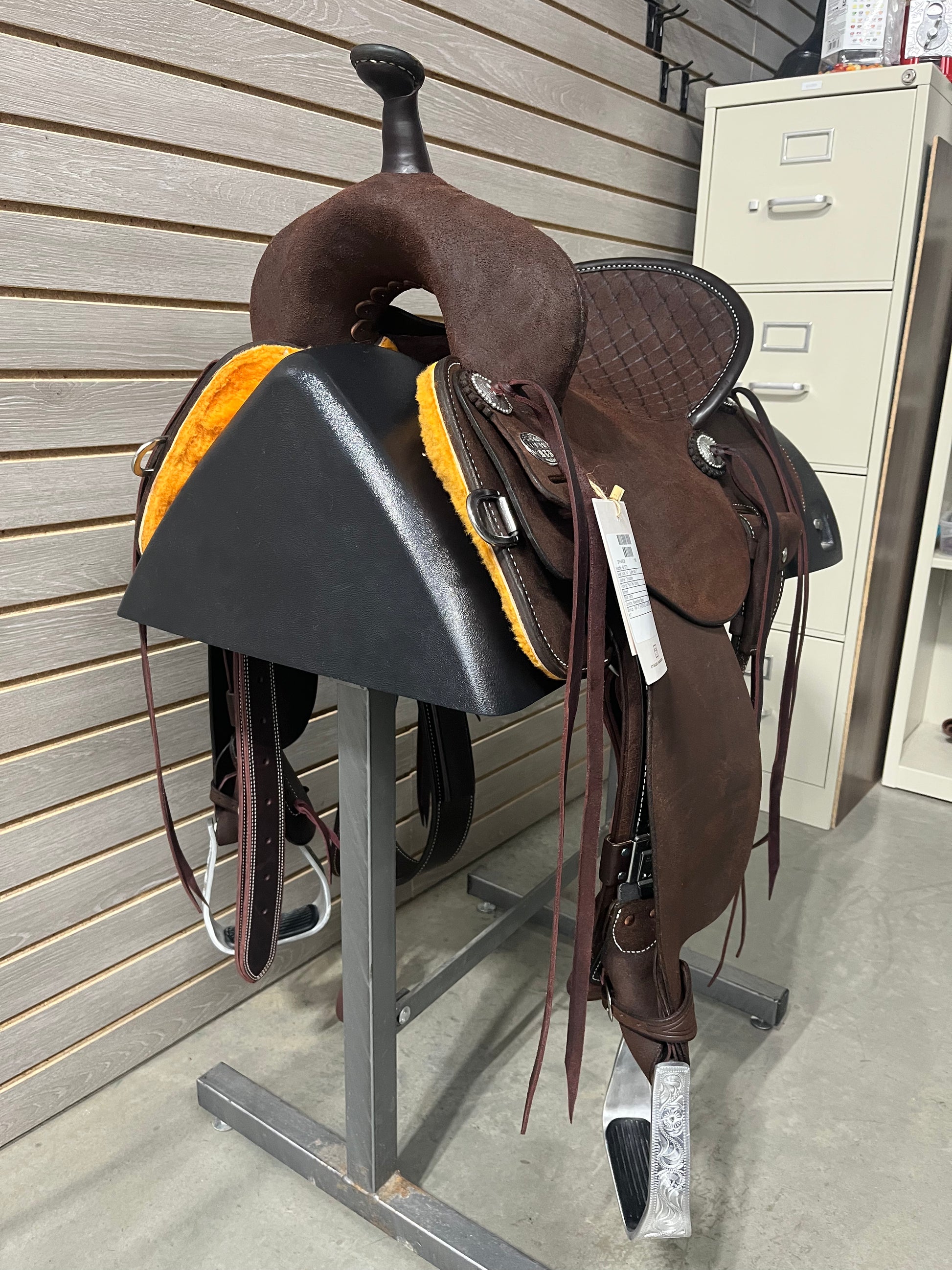 Chocolate Roughout. Quilted Stamped Hard Seat with a Pencil Roll.