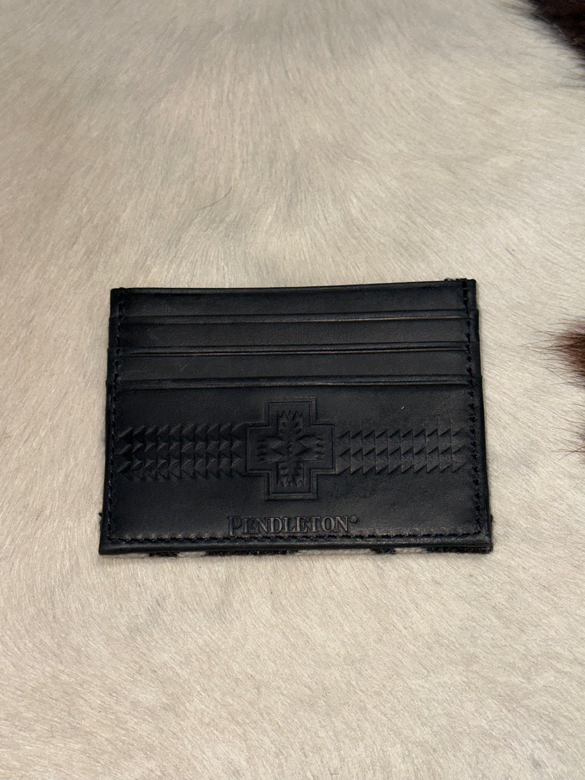 Carry cards and cash in a slim slip wallet with full-grain embossed leather card slots, wool face, and inner cash slot.