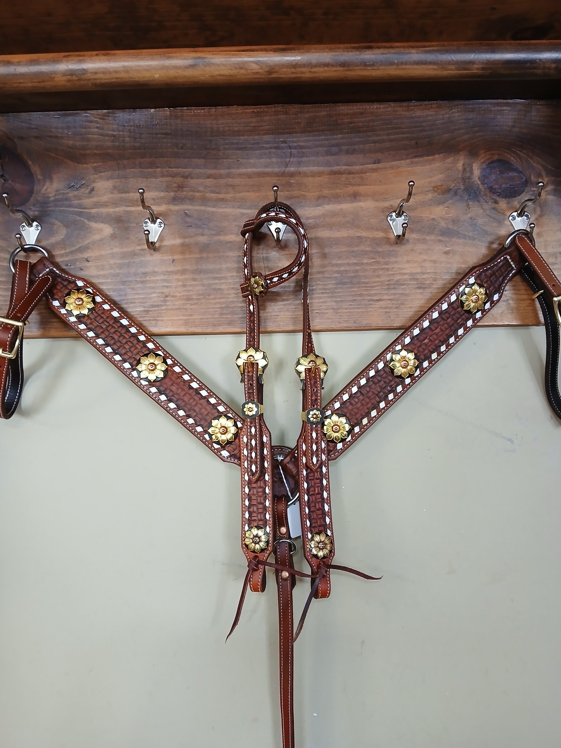 Rafter S. "Gold & Copper Flower with White Buckstitch" Tack Set
