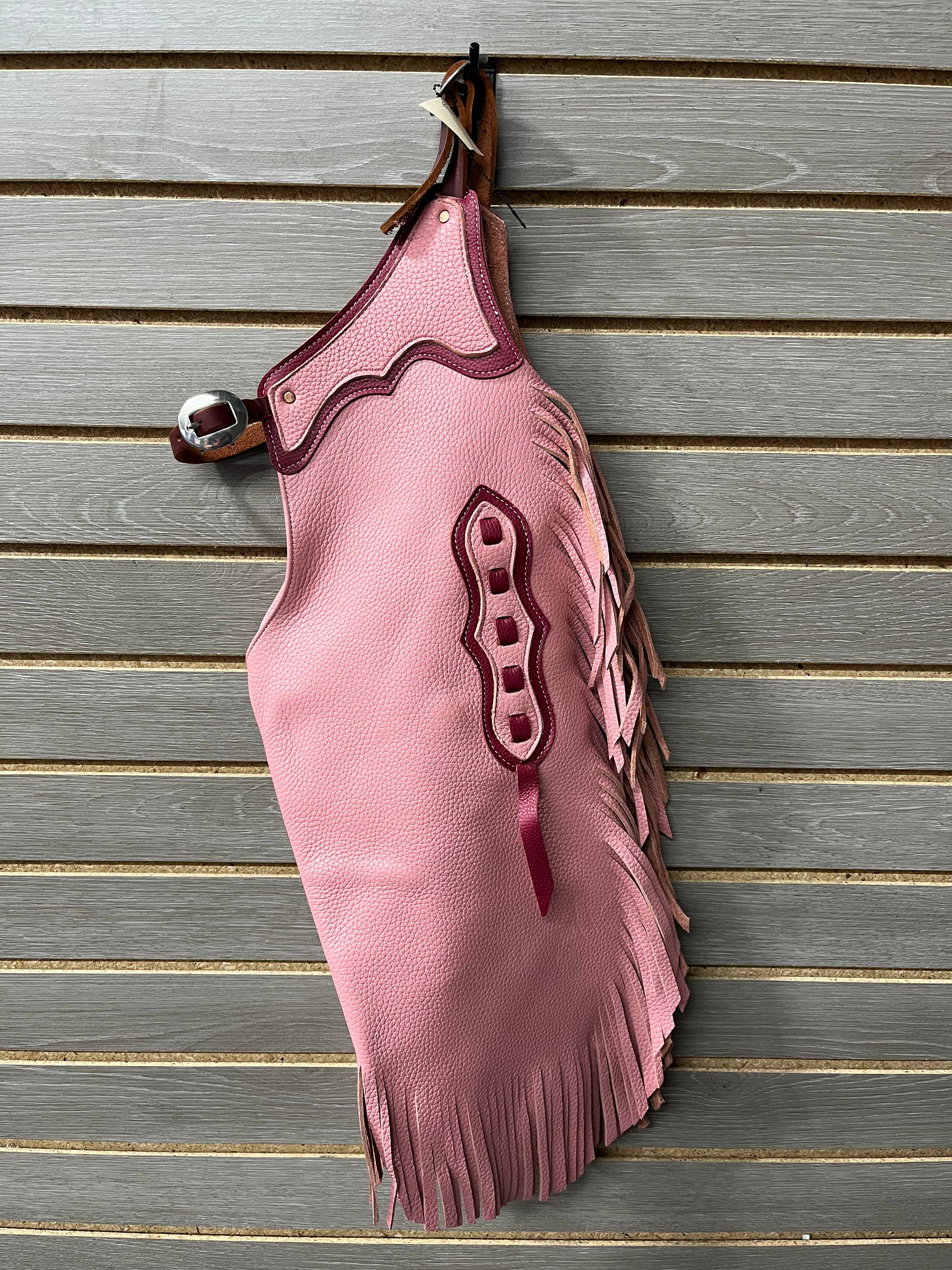 These leather chinks from Rockin' Y Saddlery are perfect for your little cowboy or cowgirl! Made in the USA with high quality, premium leather, they are sure to last. Adjustable waist with double buckle closures. Snap leg closures. 22 inch outseam from top of waist to top of fringe. 4 inch fringe.