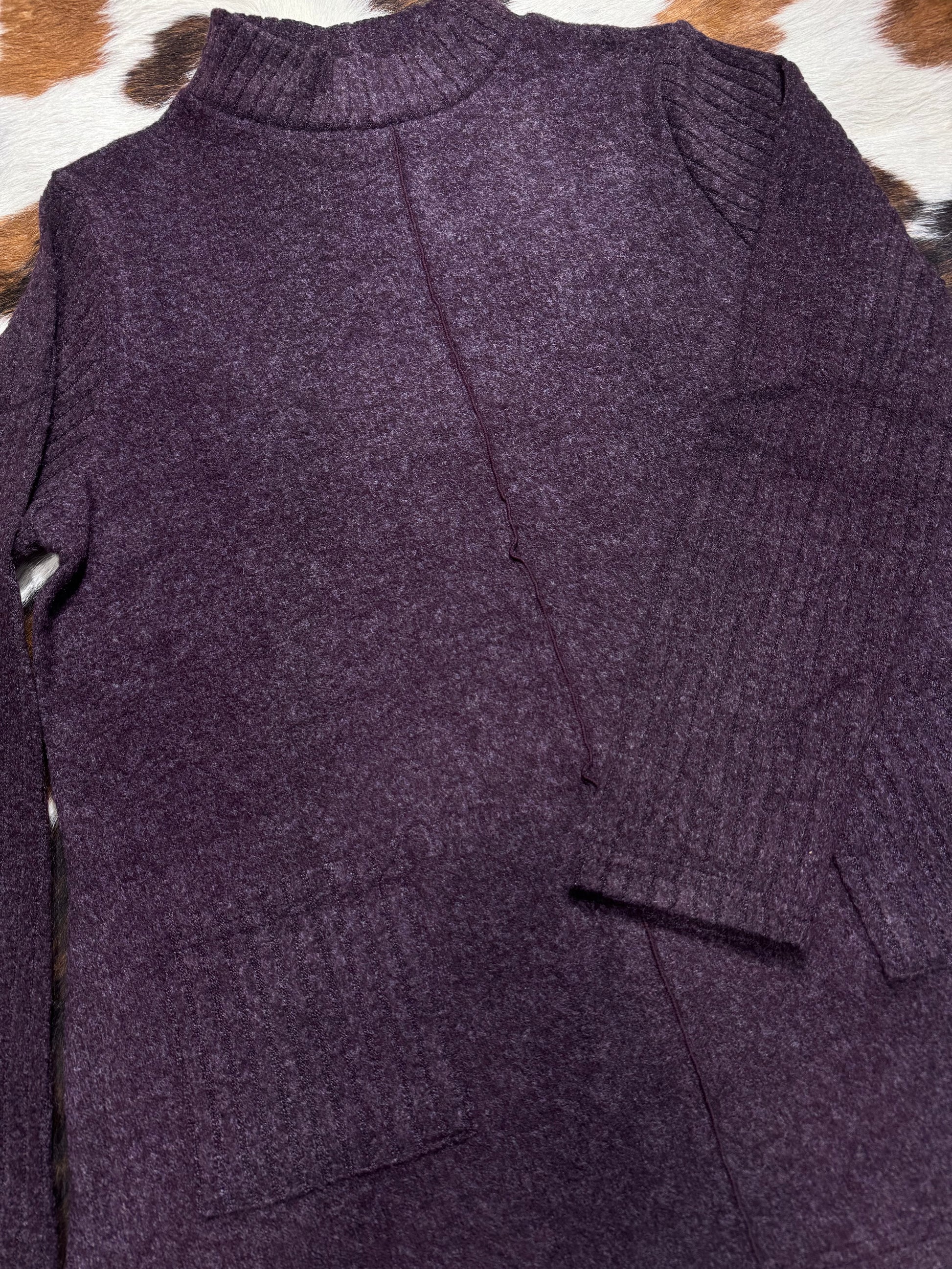 This sweater from Trisha Tyler is super soft and stretchy. It has 2 front pockets and a middle front seem running all the way down. This is a tunic so its a little longer than a normal shirt. It has ribbed arms, collar, and pockets.