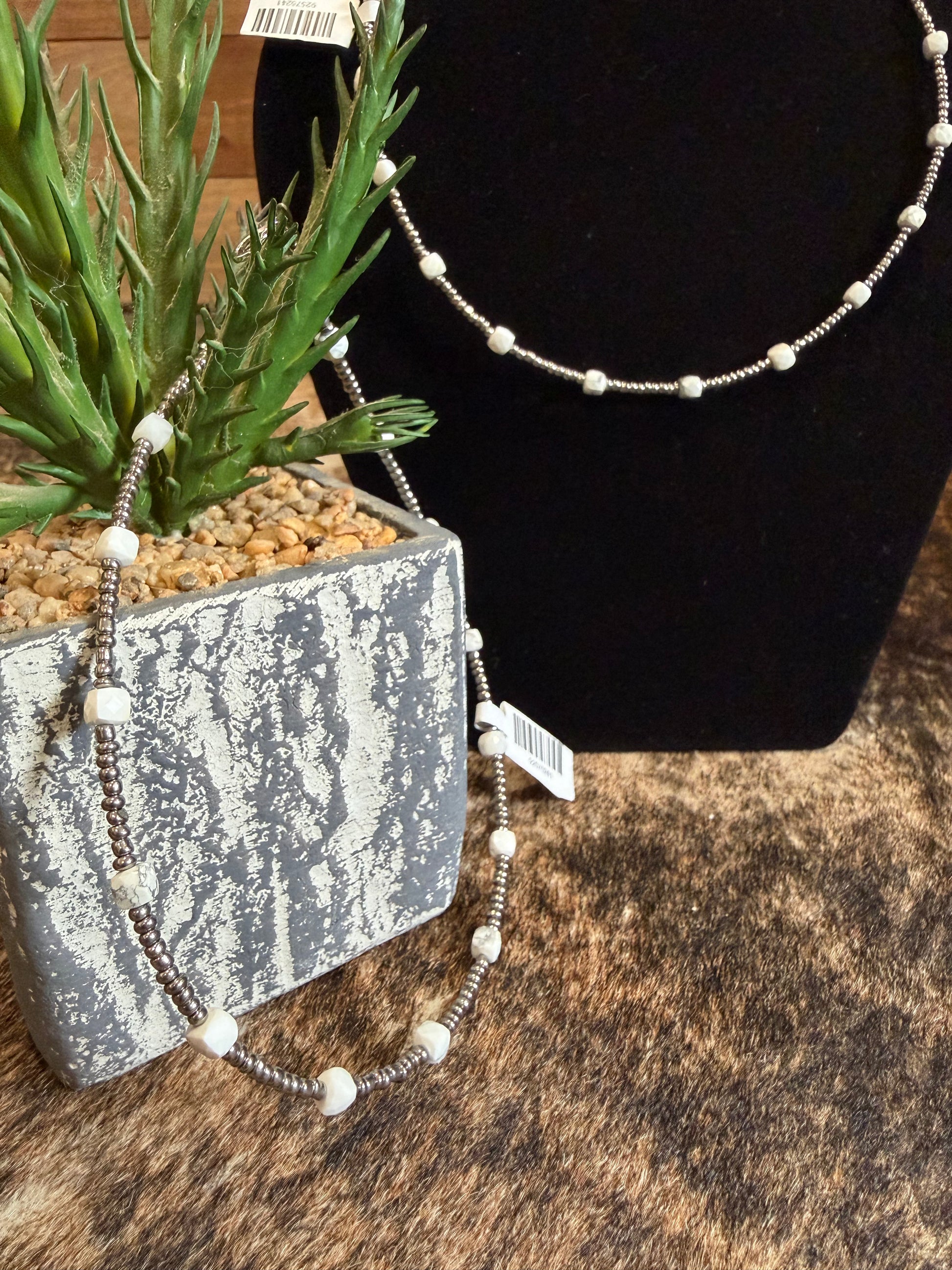 Clean, bright, and effortlessly wearable, this white howlite necklace features glass seed beads paired with white howlite beads for a soft, neutral look with subtle texture. Finished with a silver-plated chain and lobster clasp, each necklace is completely unique and easy to style on its own or layered with your favorite pearls.